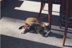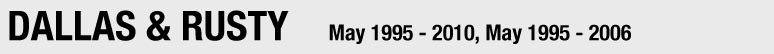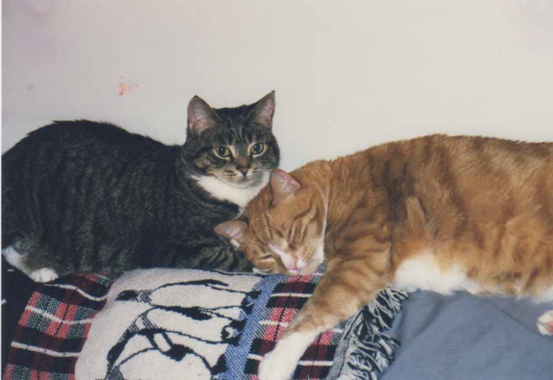 Dallas & Rusty were my first 2 cats. They were littermates and about 11 weeks old when I got them. I planned on making them outside cats, but the day I brought them home, a pair of Barred Owls flew in, sat in an oak tree in the front yard and stayed for several days. Dallas & Rusty quickly became indoor cats to avoid becoming owl food. Rusty typically used his sister as a pillow and Dallas frequently groomed her brother. They loved sitting in my lap and were fairly dog savy.